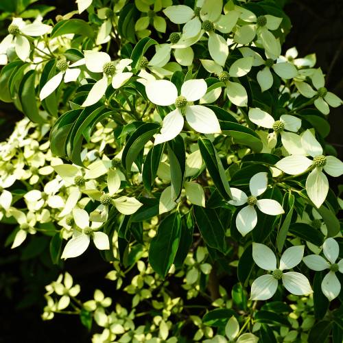 Très florifère en été, le Cornouiller de Hong Kong se couvre d'une multitude de fleurs blanches parfumées, suivies de gros fruits rouges comestibles semblables à des fraises.