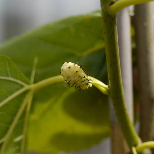 Le feuillage du murier blanc prend de jolies teinte jaunes à l'automne. Le mûrier blanc est très utilisé pour la production de vers à soie qui se nourrissent de ses feuilles. Ses fruits blanc rosé à violacé sont sucrés et comestibles. Ils se récoltent à la fin du printemps. Ce très bel arbre de parc se plante essentiellement en isolé. Il faudra éviter de le planter près d'une habitation car il a de solides racines traçantes.