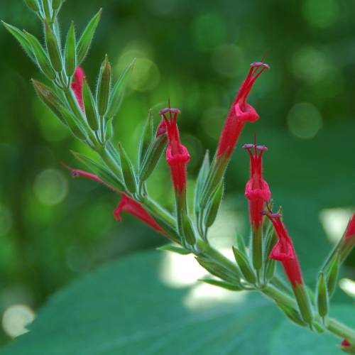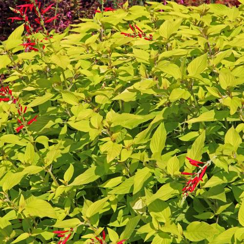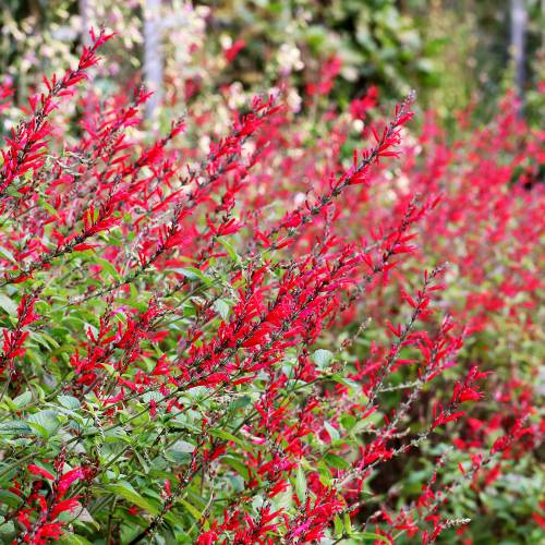 La Sauge ananas (Salvia elegans) est une plante vivace aromatique semi-ligneuse aussi considérée comme un sous-arbrisseau, très prisée pour son feuillage parfumé et sa floraison éclatante. Les fleurs d’un rouge vif apparaissent en épis dès la fin de l’été et jusqu’aux premières gelées, elles sont très mellifères.